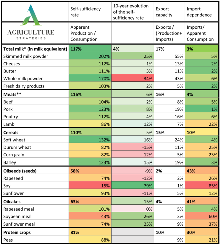 | Definition of the presented indicators (all figures presented and discussed refer to the EU 27): – Self-sufficiency rate (production/consumption): This reflects the apparent ability of a country to meet its needs through its own production. It considers the production achieved by EU countries in the current year (losses are deducted for cereals, and stocks are not taken into account). Apparent consumption includes stock variations and corresponds to: production + imports – exports. – Export capacity (exports/(production+imports)): This represents the share of production and imports that is exported, showing the export strength of the country as well as the dependence of this production on purchases from importing countries. – Import dependence (imports/apparent consumption): This is the share of imports in domestic consumption, which can be high despite a significant self-sufficiency rate. In this case, it reflects a mismatch between the finished product and consumer expectations, who may, for example, prefer to buy a cheaper imported product. |