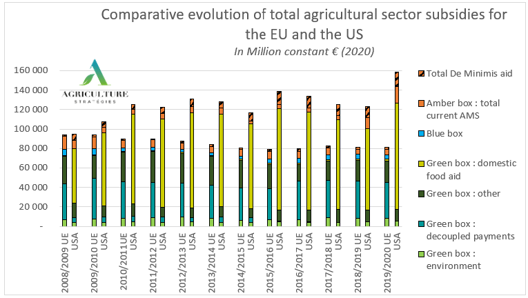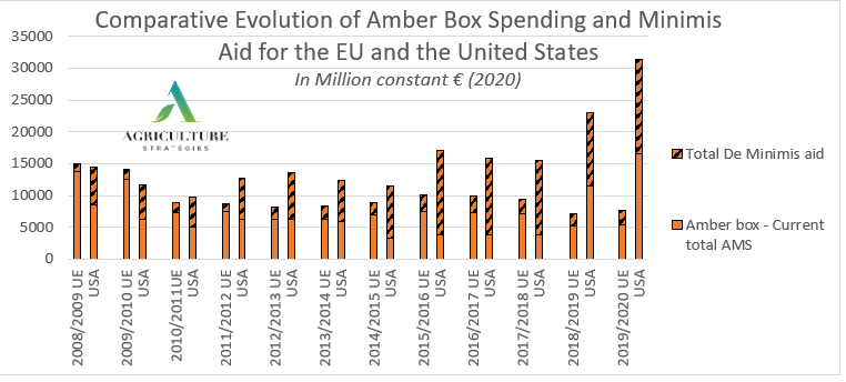 Figure 2 : Comparative Evolution of Amber Box Spending and Minimis Aid in the United States and the European Union in Constant Euros (2020), source Agriculture Stratégies based on WTO notifications