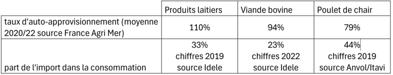 Tableau 1 : Comparaison des taux d’auto-approvisionnement et de la part de l’import dans la consommation par filière. Chiffres FranceAgriMer, Idele, Interbev, Anvol/itavi, traitement Agriculture Stratégies