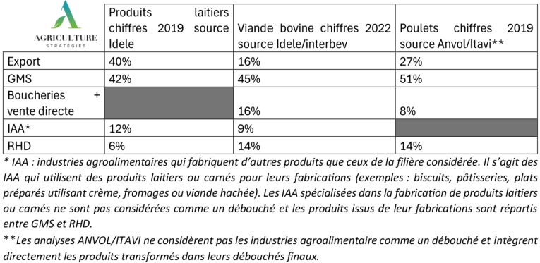 Tableau 2 : Répartition des débouchés de la production française par filière selon les volumes. Chiffres Idele, Interbev, Anvol/itavi, traitement Agriculture Stratégies