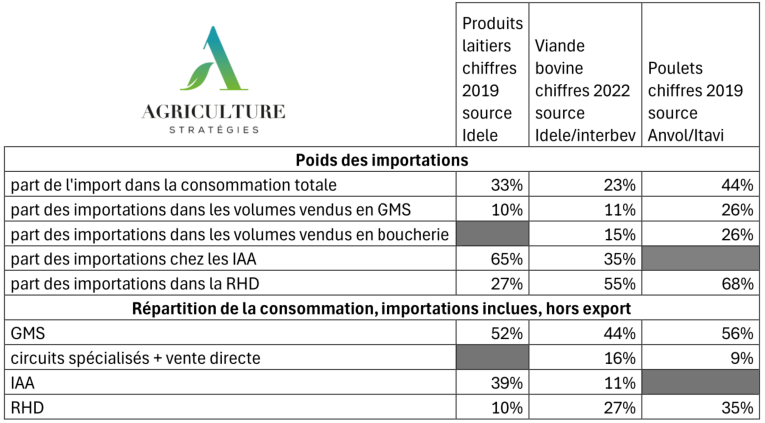 Tableau 3 : Par des importations selon les différents circuits de consommation et répartition de la consommation par filière selon les volumes. Chiffres Idele, Interbev, Anvol/itavi, traitement Agriculture Stratégies