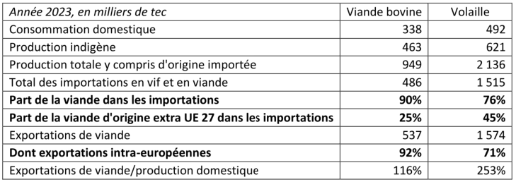 Tableau 4 : Caractéristiques de la production, des importations et des exportations de viande bovine et de volaille pour les Pas-Bas en volume, source centre de recherche de la Commission Européenne, traitement Agriculture Stratégies