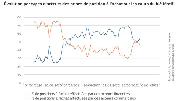This graph shows the variation of purchasing positions (acquisition of purchase contracts) by financial players (credit companies, investment funds, etc., whose action on the markets is generally purely speculative) and by commercial players (storage organizations, manufacturers, farmers, merchant houses). This analysis must however be considered with caution because it is based on purchase positions (long positions). In periods of high prices, the interest of commercial players is to take selling positions, to hedge in the event of a price drop (we speak of short positions). They therefore hold a lower proportion of long positions.