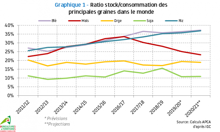 Un constat d’autant plus paradoxal au regard de bilans agricoles mondiaux qui continuent d’être de plus en plus excédentaires d’une année à l’autre. La récolte mondiale de grains devrait atteindre 2,175 milliards de tonnes à la fin de la campagne 2019/2020, et les projections pour la campagne 2020/2021 s’établissent à 2,223 milliards de tonnes, ce qui représenterait la campagne la plus abondante de l’histoire de l’humanité, aussi loin que les données chiffrées le permettent. Le rapport entre les stocks disponibles et la consommation mondiale (consommation humaine, animale et à usage industriel) se stabilise entre 27 % et 30 % sur ces cinq dernières années, mais avec des différences de plus en plus fortes entre les types de grains. Ainsi, si le ratio stock/consommation décline à 23 % pour le maïs, du fait de la très forte augmentation de la consommation animale (celle-ci a augmenté de 119 millions de tonnes depuis la campagne 2015/2016), les ratios pour le blé et le riz, dont la consommation est très majoritairement humaine, atteindrait un record de 37 % pour la prochaine campagne. Ce qui équivaut à une couverture annuelle de plus de quatre mois de la consommation mondiale de ces deux céréales, essentielles dans les différents régimes alimentaires à travers le monde. Au plus fort de la crise de 2008-2009, ce ratio n’était pas aussi élevé, la couverture annuelle n’ayant atteint qu’à peine deux mois, participant même du processus de flambée des prix des céréales et des oléagineux, et plongeant les populations de certains pays dans une dynamique d’émeutes de la faim.