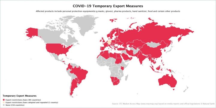 D’après les données de l’International Trade Center (ITC), quatre-vingt pays ont adopté des mesures de restrictions aux exportations (carte) depuis le début de la crise sanitaire, alors qu’à l’inverse cinquante-sept pays ont adopté des mesures de libéralisation sur leurs importations pour favoriser les approvisionnements. Sur les 130 mesures annoncées de restrictions (exportations) ou de libéralisations (importations) à travers le monde, une dizaine concerne le secteur agroalimentaire et sont concentrées sur des pays hautement stratégiques dans les équilibres alimentaires mondiaux.