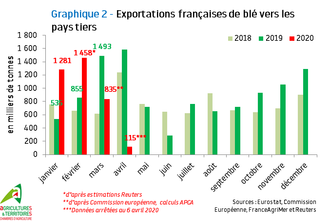 Tout d’abord, tous les pays de la zone Eurasie ont communément acté de restreindre leurs exportations de produits céréaliers bruts et transformés. La Russie a ainsi décidé de limiter ses exportations de céréales à 7 millions de tonnes pour la période d’avril à juin 2020, et de commercialiser avec des subventions 1,5 million de tonnes de ses stocks de grains sur son marché intérieur pour soutenir les consommateurs russes. Afin de limiter l’inflation sur les produits issus de la transformation céréalière comme le pain, l’Ukraine prévoit de limiter les exportations de blé à 20,2 millions de tonnes pour la campagne 2019/2020. Le Kazakhstan, troisième acteur de ce « cartel » des exportateurs céréaliers eurasiatiques, a banni les exportations de blé et de farine de blé, de sarrasin, de sucre, de tournesol et de certains légumes comme les pommes de terre et les oignons. Par rapport à l’état d’avancement des campagnes, ce sont de 3 à 4 millions de tonnes de blé en moins qui pourraient ne pas être exportés d’ici juin 2020. Ce qui a d’ailleurs occasionné des achats de précaution à l’international avec une multiplication d’appels d’offre de pays importateurs tels que l’Algérie et l’Egypte. La France a d’ailleurs particulièrement bénéficié de cet appel d’air avec un doublement des exportations de blé vers les pays tiers sur le cumul janvier-février 2020 par rapport à la même période en 2019, suivi d’une accalmie au mois de mars (graphique 2). L’Algérie et le Maroc ont représenté 62 % de ces exportations sur le mois de février avec respectivement 572 000 tonnes et 322 000 tonnes de blé acheté, mais signalons aussi le retour aux achats de l’Egypte. Ce pays est le premier importateur mondial de blé avec plus de 12 millions de tonnes achetés chaque année, la France lui a livré plus de 500 000 tonnes de blé depuis le début de la campagne 2019/2020, permettant pour les opérateurs français de retrouver à nouveau une place de choix sur un marché très largement occupé par la Russie, suivie dans une moindre mesure de l’Ukraine et de la Roumanie.