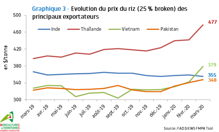 Le blé n’est pas la seule céréale concernée par ces mesures de restrictions. Contrairement à ce dernier, le marché du riz (céréale secondaire) apparaît bien plus resserré avec une poignée de pays exportateurs qui dominent les approvisionnements vers les continents asiatiques et africains. De façon quasiment simultanée, le Vietnam, le Cambodge et Myanmar (anciennement Birmanie) ont annoncé une suspension des signatures de certificats d’exportation sur le riz. Mécaniquement, le prix à l’exportation du riz des principaux pays fournisseurs s’est fortement redressé entre février et mars 2020. D’autant plus que depuis la fin de l’année 2019, en particulier pour la Thaïlande et le Vietnam, les prix se situaient déjà sur une trajectoire ascendante avec une augmentation respective de 13 % et de 17 % entre décembre 2019 et mars 2020, principalement du fait d’un manque de disponibilités sur le marché international (graphique 3).