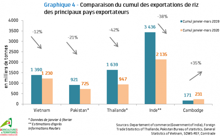 De plus, avec la décision des autorités indiennes de confiner la population pendant au moins trois semaines, les ports indiens se retrouvent dans l’incapacité d’assurer une partie des approvisionnements internationaux en riz. Le manque de personnels et l’incertitude pesant sur la circulation des bateaux ont contraint les traders indiens à stopper leurs engagements sur les livraisons de riz. Ce sont ainsi près de 500 000 tonnes de riz qui devraient rester à quai entre le mois de mars et d’avril, réduisant de près de moitié les exportations mensuelles indiennes[2]. Au regard du rythme des exportations des principaux pays fournisseurs en ce début d’année 2020, systématiquement inférieurs à la même période en 2019, cette annonce de réduction des disponibilités en Inde a d’autant plus accentué les inquiétudes des importateurs quant à des ruptures probables d’approvisionnements (graphique 4).