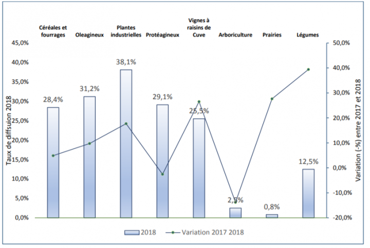Le taux de diffusion est variable d’une culture à l’autre, avec un succès très faible pour l’arboriculture et les prairies, toutes deux éligibles au dispositif des calamités agricoles.