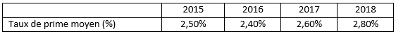 Tableau 1: évolution du taux de prime, sources : Notes de synthèse sur le suivi de l’aide à l’assurance multirisque climatique pour les exercices 2016, 2017 et 2018 par CCR pour le Ministère de l’Agriculture et de l’Alimentation