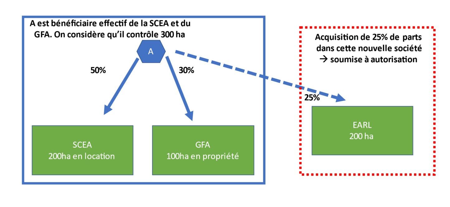 De cette situation peuvent relever des cas d’accaparement excessifs, ou d’investissements par des entrepreneurs étrangers, que nous pouvons illustrer par l’exemple suivant : une SCEA connaît la nomination d’un nouveau gérant (salarié, non associé), et le rachat de 99% de ses parts sociales par une holding (simple prise de participation financière). Dans l’opération, les associés exploitants « historiques » se retirent, et la SCEA ne dispose désormais plus d’associés exploitants. Cette opération sans modification de surface n’est pas soumise au contrôle des structures, et ce même si le nouveau gérant est par ailleurs exploitant dans d’autres exploitations, individuelle ou sociétaires.