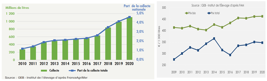 Figure 1: Evolution de la collecte annuelle de lait biologique et comparaison du prix du lait standard et conventionnel, source Idele
