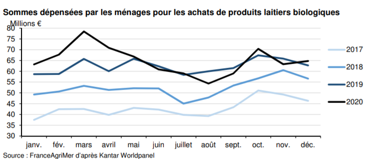 Après une explosion liée au premier confinement, la progression des ventes de produits laitiers bio s’est ralentie en 2020 par rapport aux chiffres de 2019, et commence à reculer en 2021, plus fortement que le conventionnel : sur les 7 premiers mois de 2021, « c’est le cas en lait de consommation liquide (-9,7 % pour le bio, -6,4 % pour le conventionnel), en fromage frais (-16,1 % en bio, -3,3 % en conventionnel), en beurre (-5,8 % en bio, -4,8 % en conventionnel) en crème (-12,5 % en bio, -3,6 % en conventionnel) et en fromage (-6,6 % en bio, -2,8 % en conventionnel). Deux exceptions : les yaourts, où le bio limite mieux la casse que le conventionnel (-3,5 % contre –4,7 %) et les desserts frais (+7,7 % en bio, +0,2 % en conventionnel) »[4].