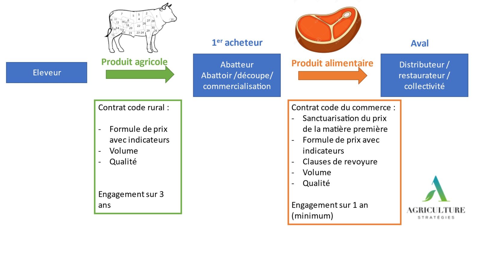 Alors que la filière avait pour habitude de s’adapter aux marchés, conduisant à un manque total de visibilité sur le prix payé au producteur, qui devait attendre de recevoir son bon de livraison pour connaitre le prix payé pour ses bêtes, la contractualisation change la donne. Le système de contrats en cascade avec sanctuarisation de la matière première vise à bâtir le prix de la denrée finale sur la base du prix payé à l’éleveur. Le prix de la matière première, non négociable de contrat en contrat, va donc être le socle du prix final, et sera lié, au moins en partie, aux coûts de production, dans l’esprit des EGA.