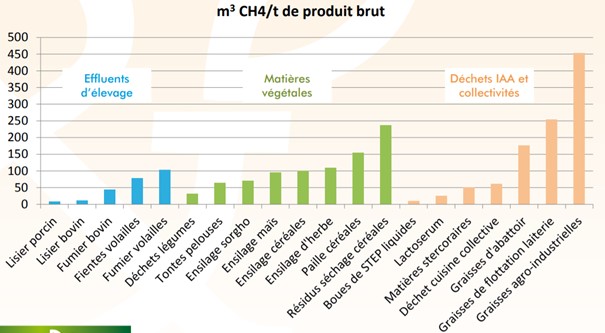 Figure 1 : le potentiel méthanogène des différents substrats, source Tech & bio