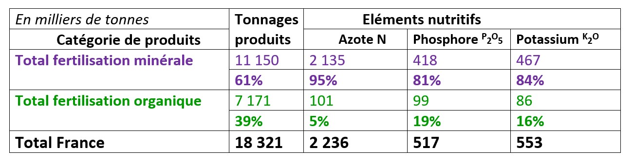 Tableau 1: Fertilisants organiques et minéraux commercialisés en 2020, d’après les chiffres Unifa