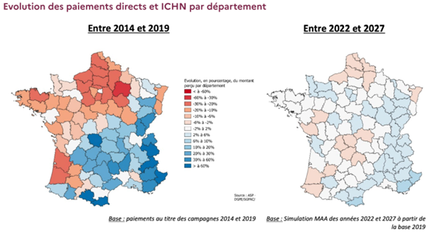 L’ensemble de ces compromis permet d’aboutir aux cartes présentées sur le document de communication, qui annoncent fièrement qu’au contraire de la réforme précédente, l’évolution des paiements directs sera très modérée : « Les variations de paiements directs et de l’ICHN pour chaque grande filière (OTEX) sont comprises entre 3 % et 4 %, quand les réformes précédentes entrainaient des variations pouvant atteindre voire dépasser les 30 %».