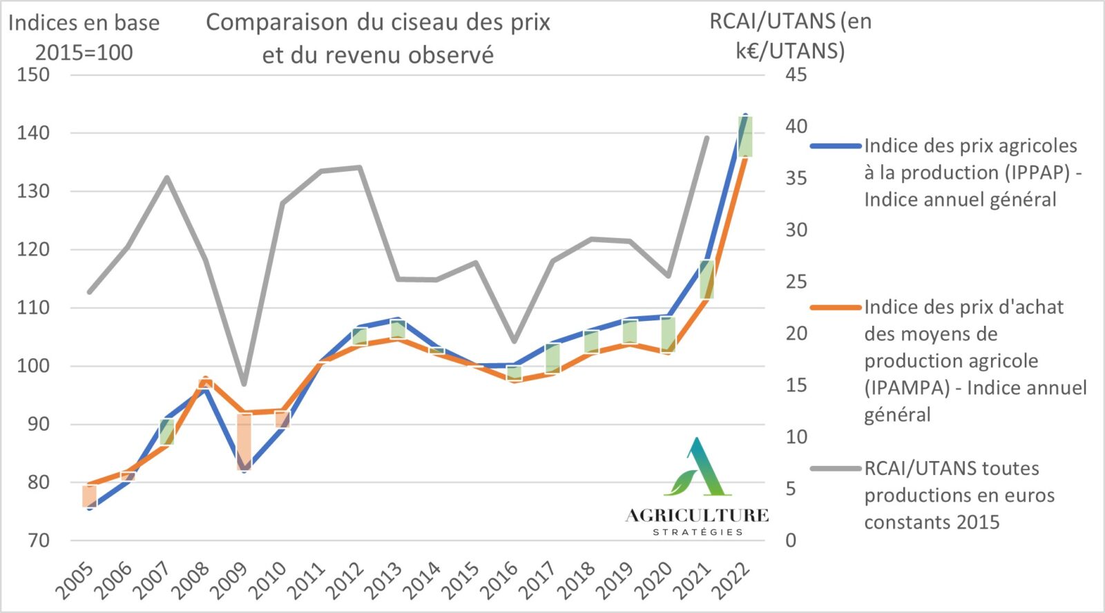 Le phénomène appelé « ciseau des prix » intervient quand les courbes des coûts de production des prix de vente agricoles (IPAMPA et IPPAP) se croisent, que l’une augmente tandis que l’autre baisse dans des proportions importantes. L’analyse de ces courbes donne un indicateur intéressant pour estimer si, en tendance, l’équilibre des marchés est en faveur ou en défaveur du secteur agricole. Lorsque l’IPPAP monte plus vite que l’IPAMPA, cela signifie que l’augmentation des prix de vente est en théorie plus élevée pour l’agriculteur que l’augmentation de des prix de ses intrants.