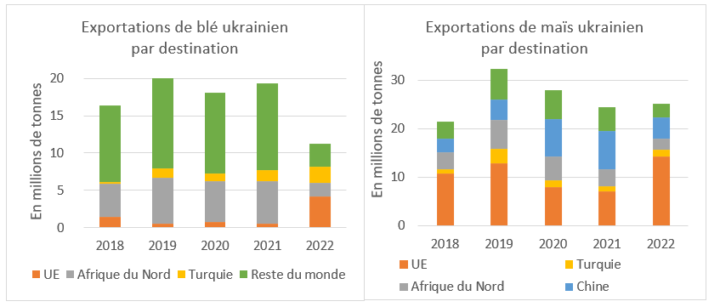 Figure 2 : Evolution des exportations de blé et de maïs ukrainien selon la destination, source Comtrade traitement Agriculture Stratégies