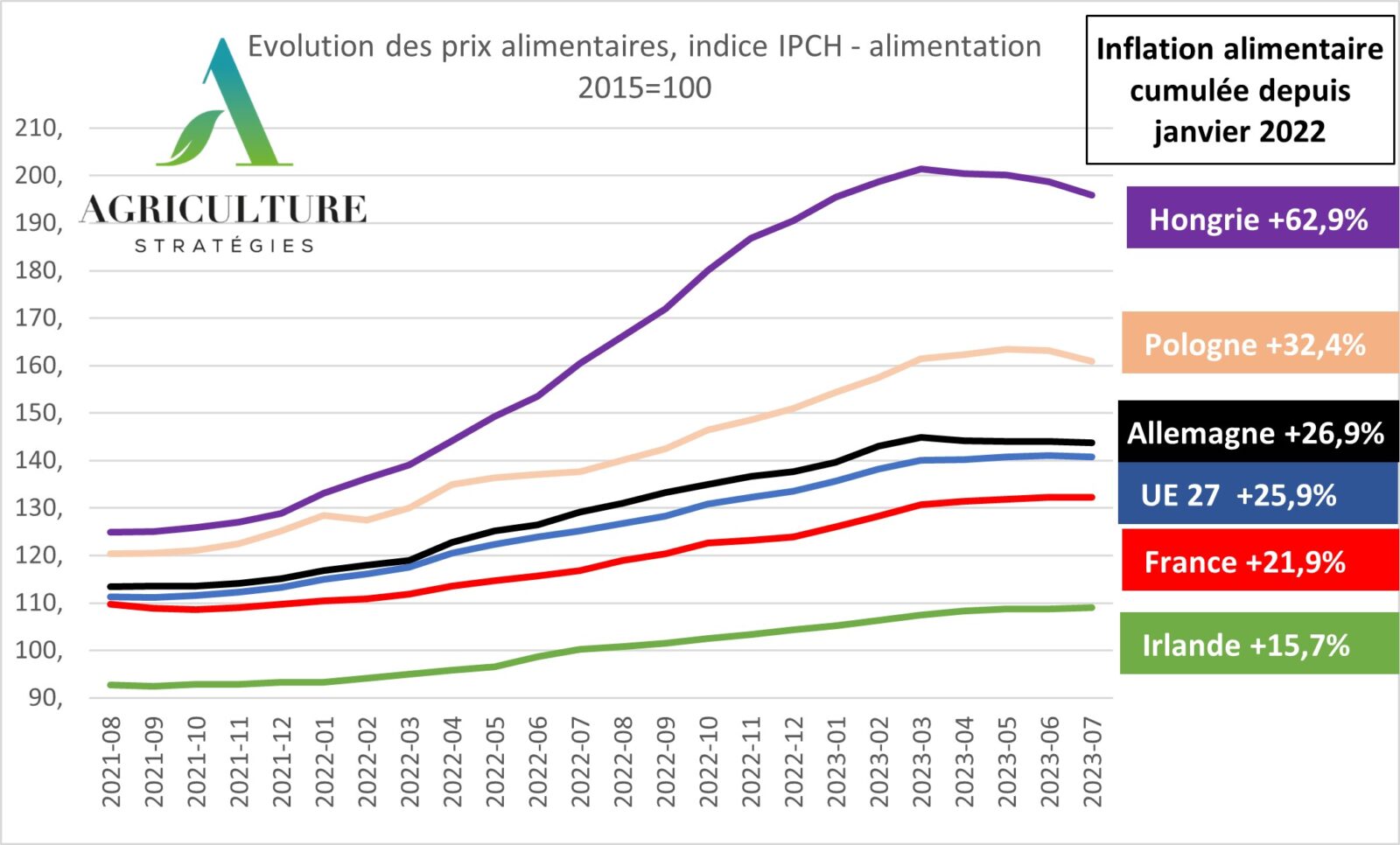 Figure 1 : Evolution de l’IPCH alimentaire et variation sur un an (de juillet 2022 à juillet 2023), source Eurostat traitement Agriculture Stratégies