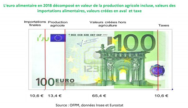 - Le prix du produit fini ne dépend pas que de la matière première agricole. Dans son rapport de 2022[3], l’Observatoire de la formation des prix et des marges des produits alimentaires (OFPM) avait déterminé la composition de « l’euro alimentaire » pour les dernières données disponibles, à savoir 2018. Sur 100 € dépensés par les ménages en consommation alimentaire, la valeur de la production agricole ne représentait que 13,4 €. La part des produits alimentaires importés était de 10,6 € et la valeur créée en aval (donc par l’industrie, le commerce, les services et les transports) était de 65,4 €.