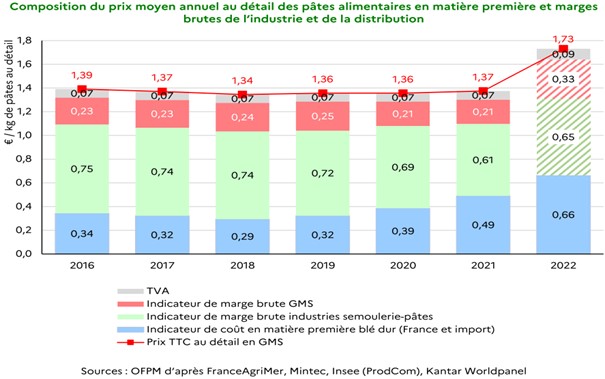 Les pâtes sont donc un produit industriel qui bénéficie d’économies d’échelles, et la part de la matière première agricole dans le produit fini y est bien plus élevée que pour la baguette : du fait de l’augmentation du prix du blé elle a atteint 40,4% du prix hors TVA, contre 37,6% en 2021 et 30% en 2020. Après une année 2021 où les transformateurs avaient comprimé leurs marges pour compenser une première augmentation du prix du blé dur, l’année 2022 a été caractérisée par une augmentation d’un niveau inédit, pour partie expliquée par l’augmentation des coûts mais également aussi par opportunisme. L’OFPM émet ainsi l’hypothèse que « les GMS (et l’industrie dans une moindre mesure) ont saisi l’opportunité d’un déblocage des prix à la consommation pour reconstituer leurs marges pratiquées avant Covid et la flambée des cours du blé dur de 2021 ».