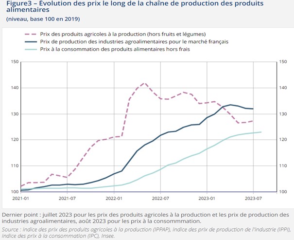- « les prix agricoles à la production (hors fruits et légumes) se sont accrus de 23 % par rapport à 2021. La hausse est de 16 % pour les prix à la production des industries agroalimentaires et de 7 % pour les prix à la consommation des produits alimentaires (hors produits frais). »