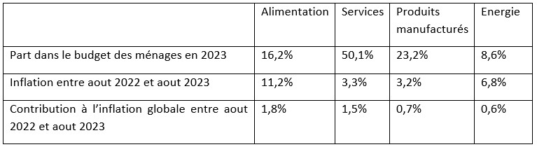Rappelons les bases : une baisse de l’inflation ne signifie pas une baisse des prix mais un ralentissement de la hausse des prix. L’inflation étant généralement mesurée sur une période d’une année glissante, tant que les prix restent supérieurs à ce qu’ils étaient un an plus tôt, elle continue à être positive. Ensuite, les produits alimentaires représentent 16,2% du budget des ménages, contre 50% pour les services ou encore 23,2% pour les produits manufacturés. Ainsi, sur un an, l’inflation alimentation est de 11,2% pour aout (elle s’établirait à 9,6% en septembre) mais elle n’a contribué que pour 1,8 points à l’inflation globale qui est elle de 4,8 %[7].