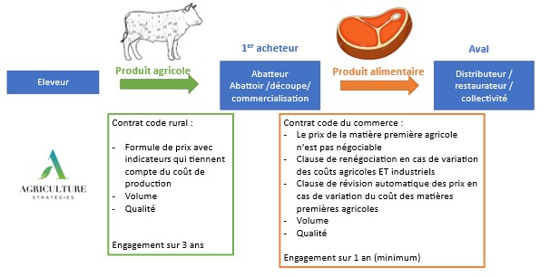Figure 1 : Schéma simplifié des relations contractuelles impactées par les lois Egalim en vigueur en 2024, source Agriculture Stratégies