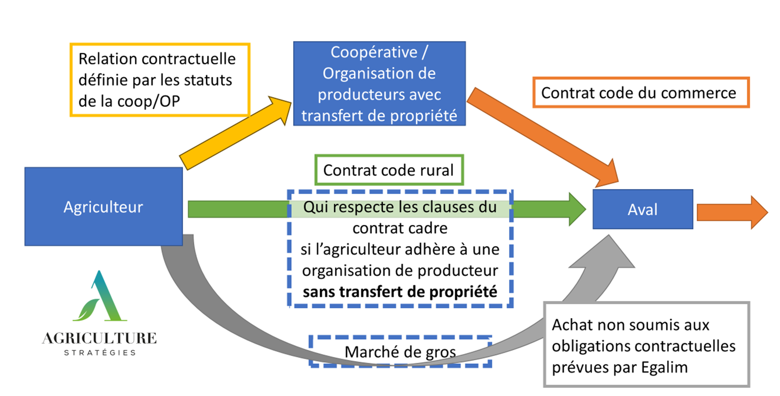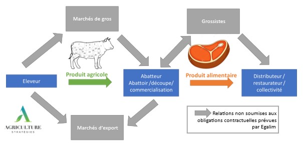Figure 3 : Schéma simplifié des relations contractuelles impactées par la loi Egalim et de ses exemptions, source Agriculture Stratégies
