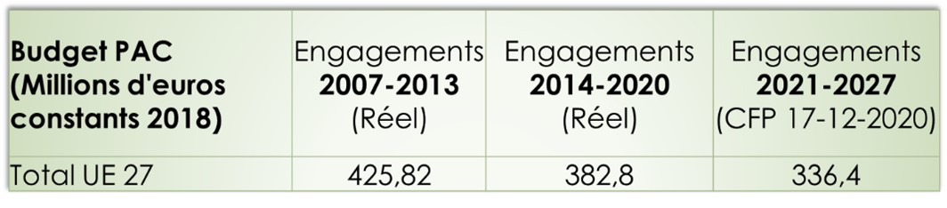 | Moyenne annuelle des paiements directs du 1er pilier en France en euros constants 2018 | 8,9 milliards /an | 7,1 milliards /an | 6,7 milliards / an |