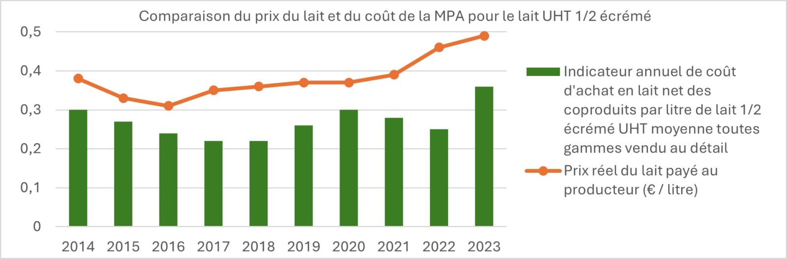 Figure 3 : Comparaison du prix réel du lait payé au producteur et du coût de la matière première agricole pour le lait UHT demi-écrémé, source Agricultures Stratégies d’après données OFPM 2024