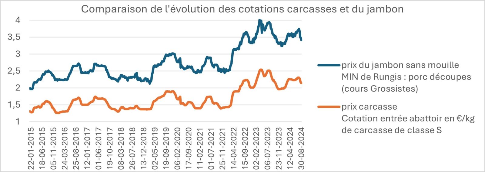 Figure 4 : Comparaison des cotations entrée abattoir (classe s) et du prix du jambon sans mouille cours grossiste du MIN de Rungis, sous RNM, traitement Agriculture Stratégies