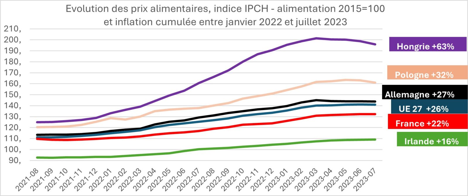 Figure 5 : évolution de l’indice des prix des denrées alimentaires, base 100 en 2015 – données Eurostat, traitement Agriculture Stratégies
