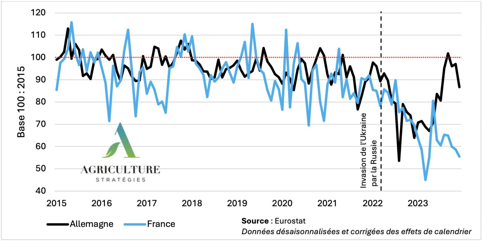 Figure 2 : Indice de production des engrais azotés en France et en Allemagne (2015-2024)