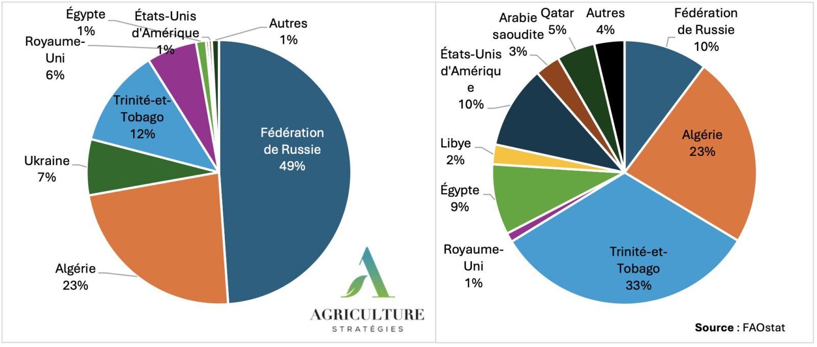 Figure 3 : Principaux fournisseurs d’ammoniac anhydre de l’UE-27 en 2019 (gauche) et 2023 (droite) (quantités)