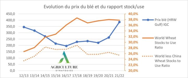 The very sharp increase in the price of wheat observed in 2022 can easily be attributed to the result of an accumulation of tensions on the market such as low stock/use ratio “excluding China”, fears of availability of Ukrainian and Russian cereal, and high insurance premiums in an inflationary context linked to rising energy prices.