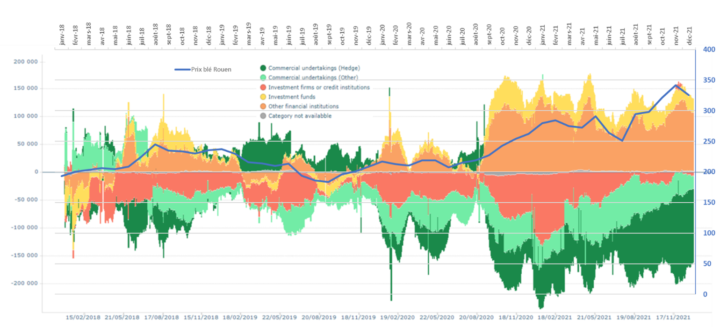 The graph below shows the evolution of the net positions taken by the different players between 2019 and 2021 and the price of wheat. Net position is the difference between a trader’s long (buy) and short (sell) positions at any given time. The upper part of the chart represents positive net positions which reflect a position orientation towards buying, while the lower part represents orientation towards selling. The green zones are those of salespeople, financiers are yellow, orange and red.