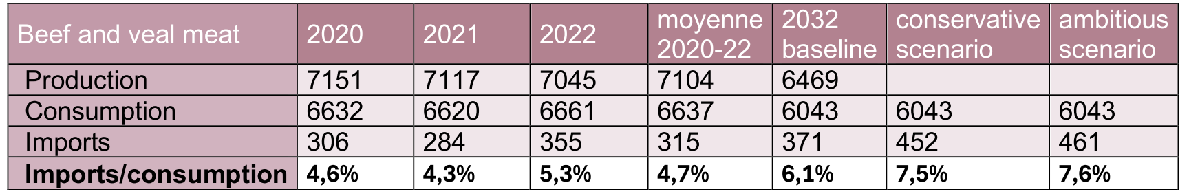 Table 1 : Evolution of production, consumption, imports, and import ratio for European beef, in thousand tons, source: European Commission, JRC, Agriculture Strategies calculations