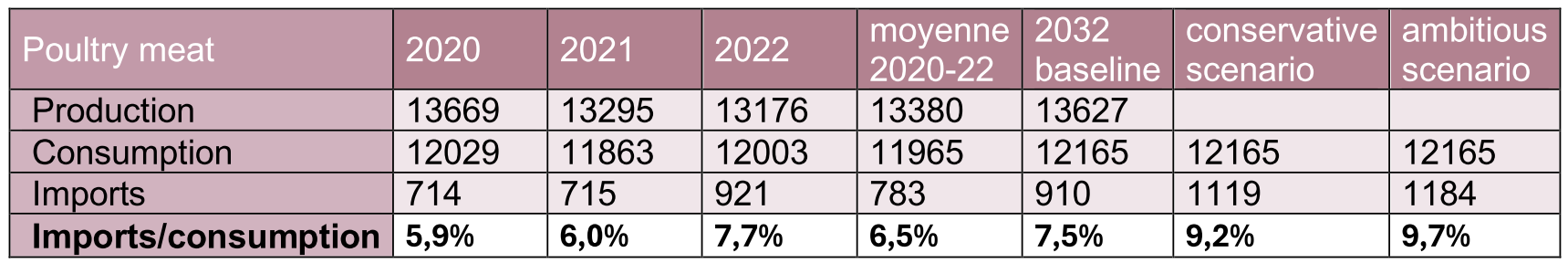 Table 2 : Evolution of production, consumption, imports, and import ratio for European poultry meat, in thousand tons, source: European Commission, JRC, Agriculture Strategies calculations