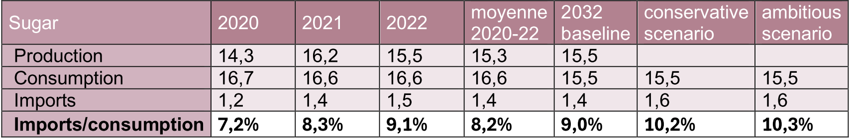 Finally, for sugar, the estimated production in 2032 is expected to be at the same level as in 2022, and domestic consumption would decrease (even though it has remained relatively stable since 2019). In the absence of new agreements, imports would remain stable at their average level of the past three years, but the agreements under negotiation include new quotas that would increase imports by 13 to 14% over the volumes already imported. If domestic consumption decreases as expected, the share of imports will exceed 10% of total consumption.