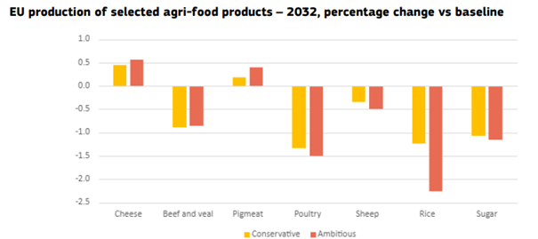 Figure 2 : Estimation of changes for EU production depending on the sector in case new agreements are signed by 2032, source: JRC