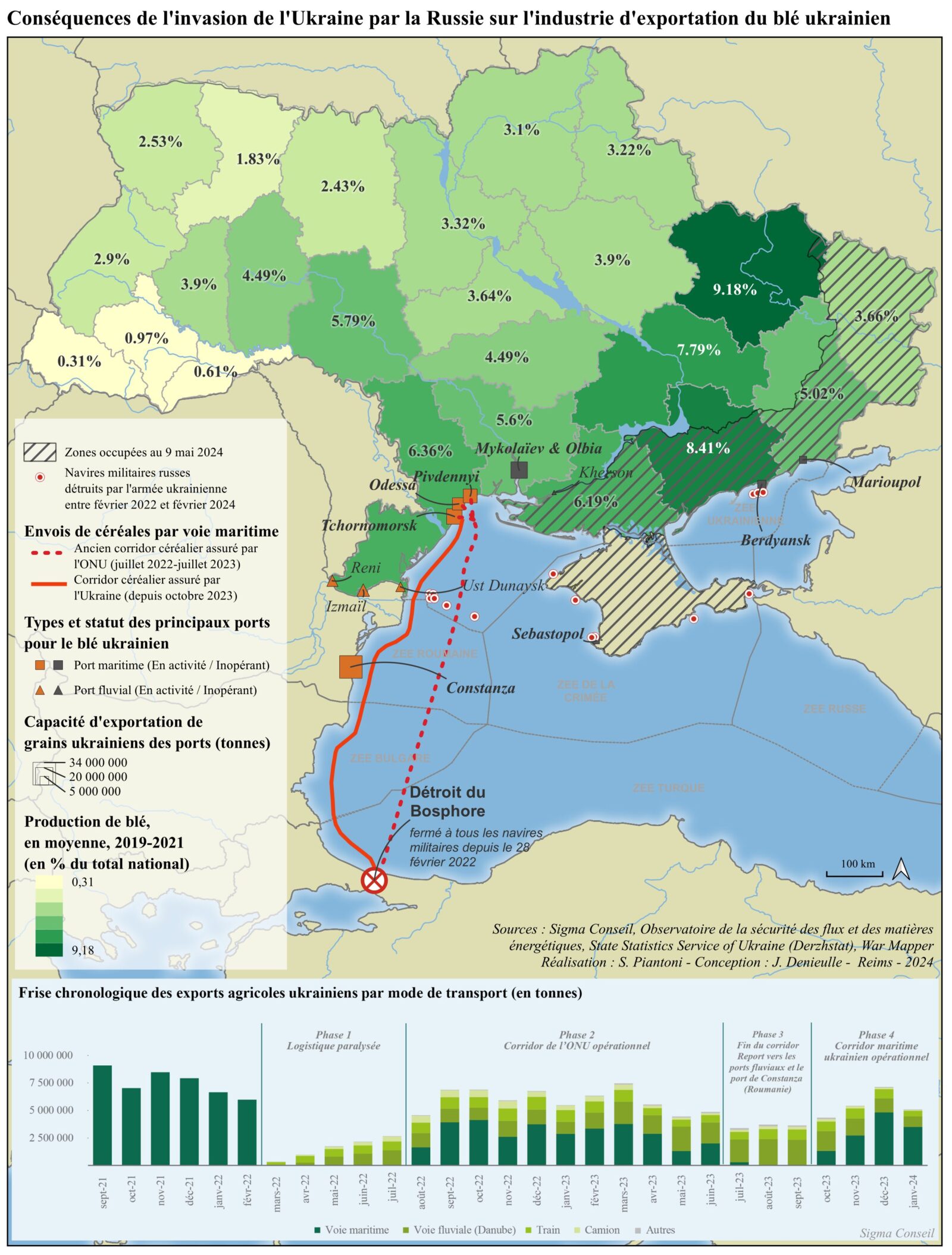 Map 1 : Consequences of Russia’s invasion of Ukraine on the Ukrainian wheat export industry. Realisation : S. Piantoni – Conception : J. Denieulle, 2024